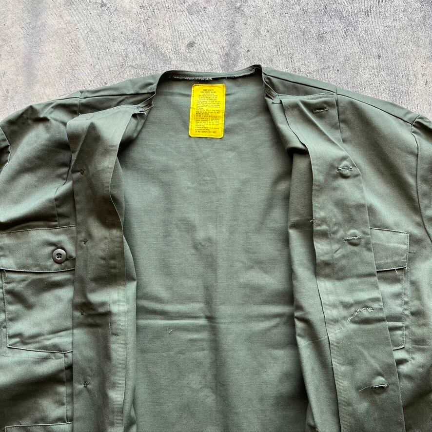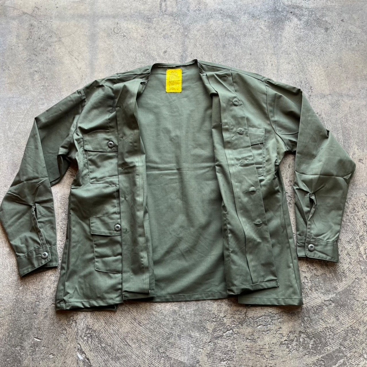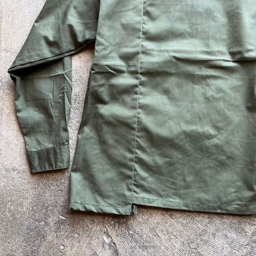 デッドストックの80年代のUS UTILITY SHIRTSを2枚使用し見頃の横幅を出したゆっくりとしたデザインです。