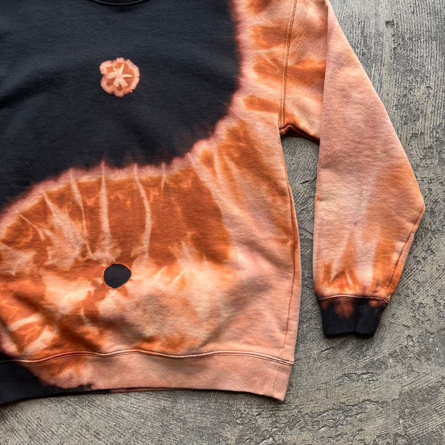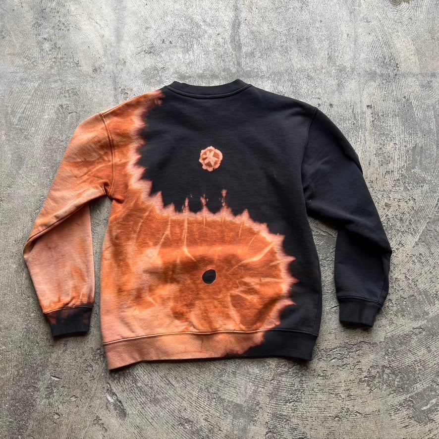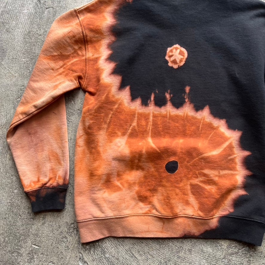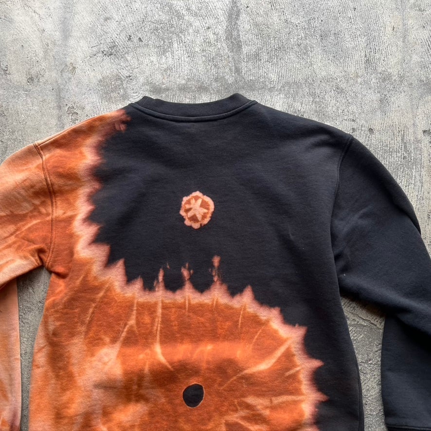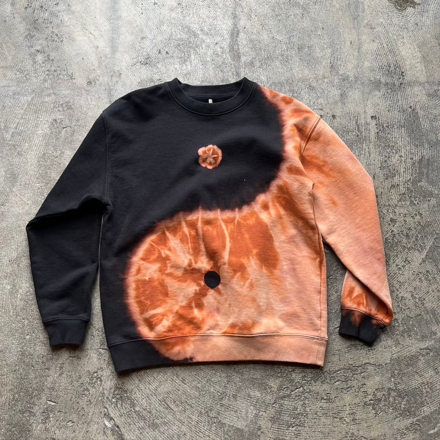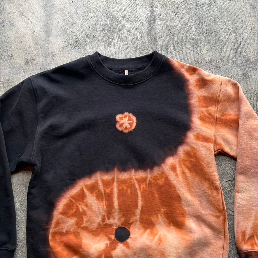 一点一点、染め師による手仕事の抜染が生み出す模様は月や波を思わせます。裏表両面に陰陽が流れるように広がり、全身を包み込む構図。偶然が重なり生まれた滲みと、大らかで力強い陰陽のコントラスト。