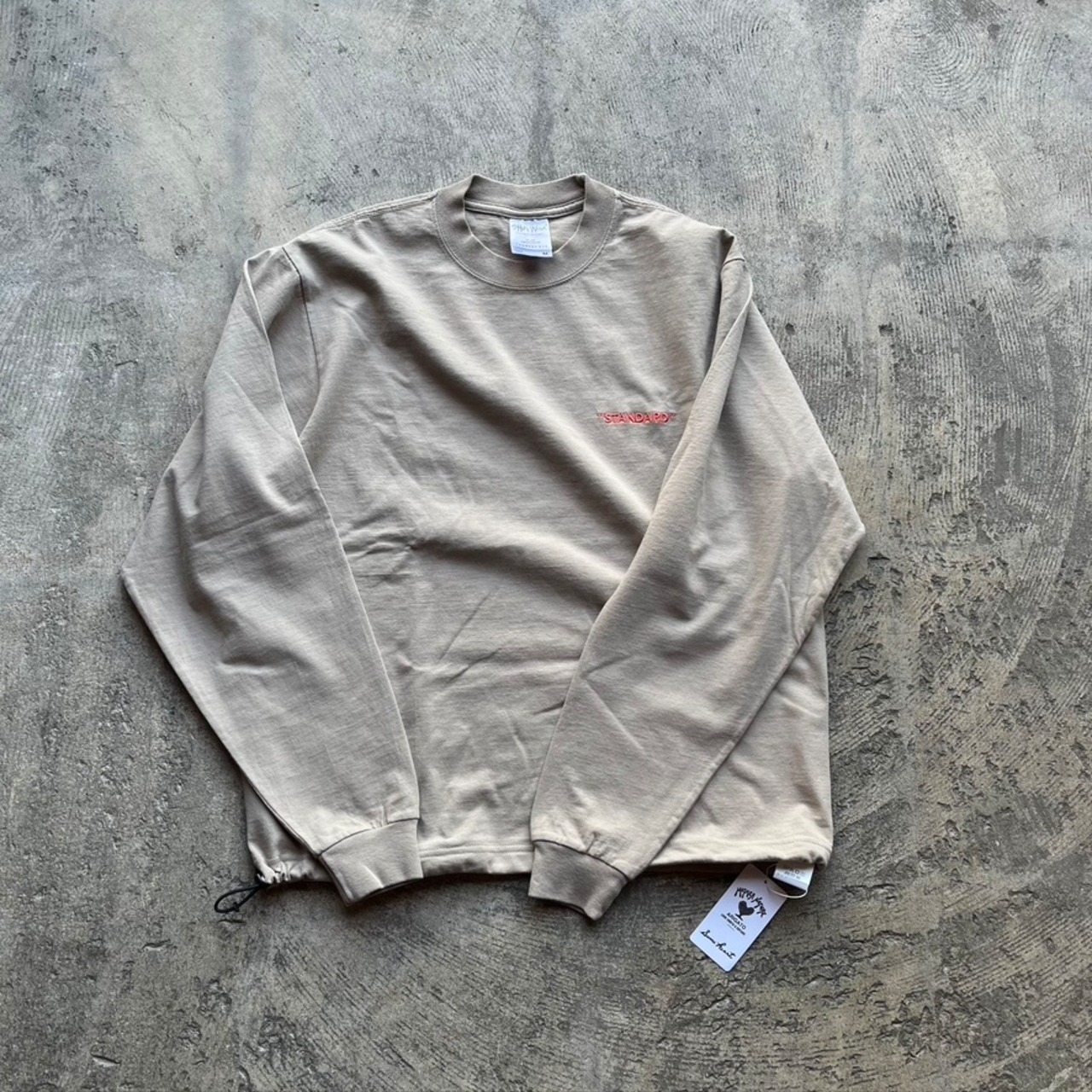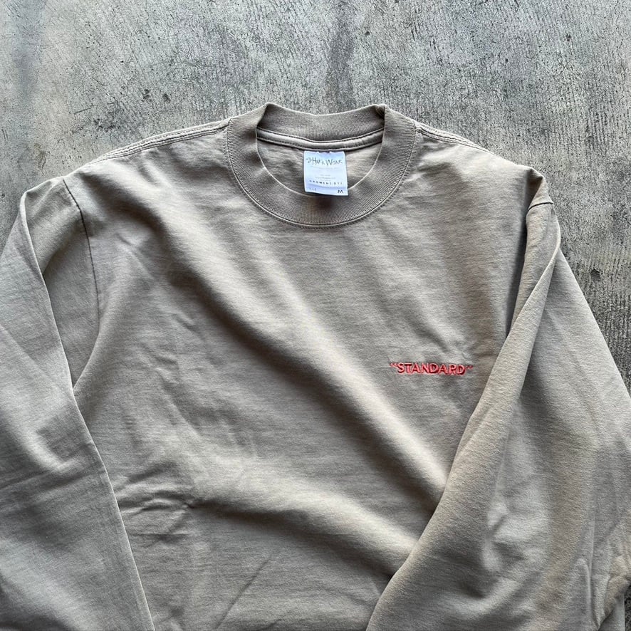 SHAKAWEARのガーメントダイシリーズの長袖TEEに”STANDARD" の刺繍を施し、裾にはストリングを内蔵。スウェットのような丸みの あるシルエットに変化させることができます。8.5ozの丈夫な素材 で、着用を重ねてもネックの伸びもほぼ見られない、デイリーに愛用 するにはもってこいのアイテムです。
