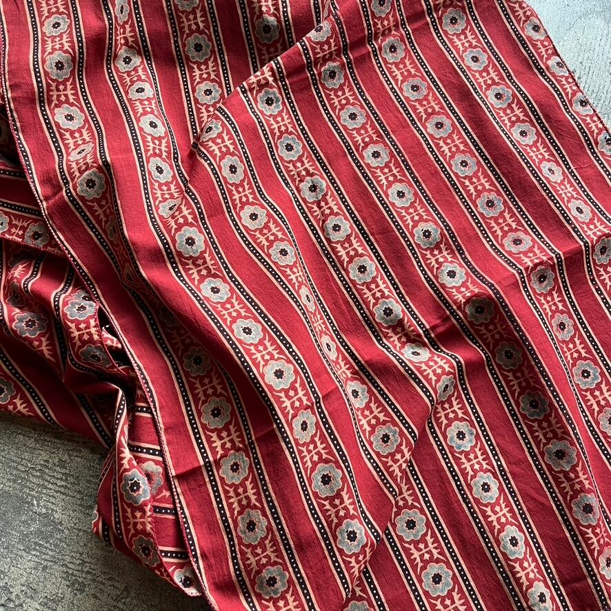 ハンドブロックプリントは1枚ずつ職人さんにより手作りされている為色の入り方や色味の違い、柄のズレインクハネ、滲みなどがあり1枚1枚違う生地に仕上がっています。